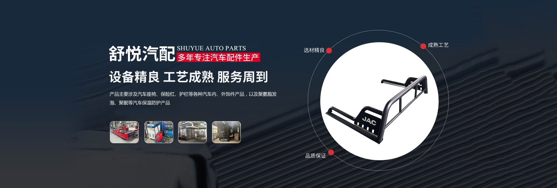 揚(yáng)州舒悅汽配有限公司經(jīng)過(guò)多年的穩(wěn)定發(fā)展,業(yè)績(jī)一直蒸蒸日上。公司產(chǎn)品主要涉及汽車座椅、保險(xiǎn)杠、護(hù)欄等各種汽車內(nèi)、外飾件產(chǎn)品,以及聚氨酯發(fā)泡、聚脲等汽車保溫防護(hù)產(chǎn)品。其主要是為江淮、金龍,奇瑞等公司服務(wù),已連續(xù)多年成為江淮、金龍等公司的A級(jí)供應(yīng)商。        公司成立于1997年,現(xiàn)坐落于揚(yáng)州市儀征劉集盤古工業(yè)集中區(qū)202號(hào),公司占地面積26640平 方米,廠房建筑面積18512平方米。公司擁有先進(jìn)的制造設(shè)備、可靠的生產(chǎn)工藝、完善的檢測(cè)手段和科學(xué)的管理,在售前和售后服務(wù)中做到快速反應(yīng),應(yīng)急應(yīng)變,為客戶提供優(yōu)良產(chǎn)品和滿意服務(wù)。公司的產(chǎn)品開(kāi)發(fā)能力和生產(chǎn)規(guī)模在同行業(yè)中處于前列的地位。        揚(yáng)州舒悅?cè)吮小罢\(chéng)信雙嬴”的原則,發(fā)揚(yáng)“誠(chéng)信、務(wù)實(shí)、創(chuàng)新、貢獻(xiàn)”的企業(yè)精神,恪守“顧客至上”的經(jīng)營(yíng)宗旨,致精從業(yè),不斷引進(jìn)新技術(shù)、新材料。以優(yōu)良的產(chǎn)品、合理的價(jià)格和周到的服務(wù)參與市場(chǎng)競(jìng)爭(zhēng)。公司愿與國(guó)內(nèi)外朋友建立真誠(chéng)的合作伙伴關(guān)系,攜手共創(chuàng)輝煌!